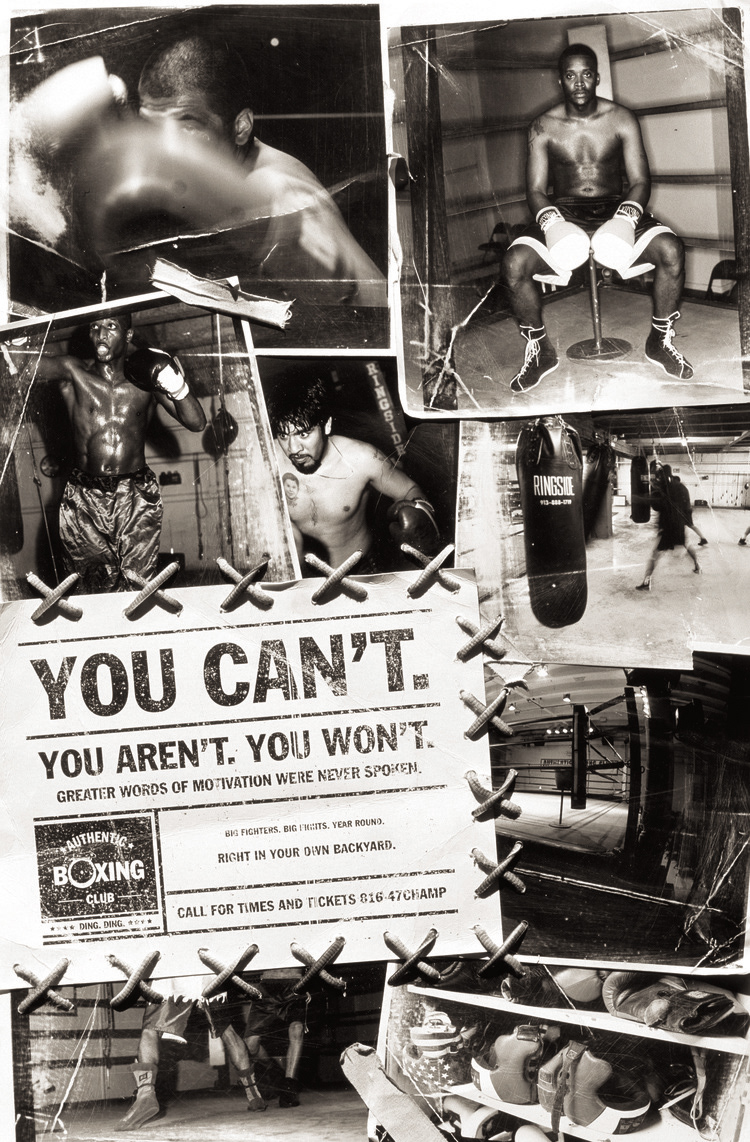 Some pure fun, pro-bono work for a local boxing club. This isn't cardio kickboxing. This is the real thing in the ring, and we captured that ferocity through a raw voice, roughed-up design, and gorgeously brutal photography.